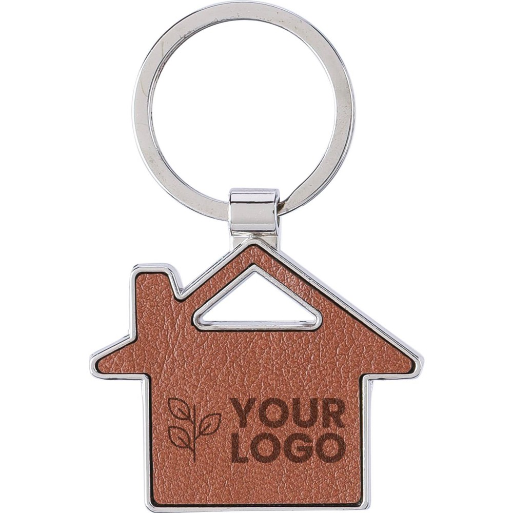 Recycled leather keychain with a metal ring. House shape. Includes embossed recycled leather logo on the side. Individually packaged in a brown cardboard sleeve.