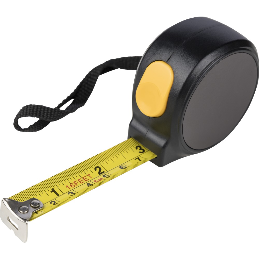 ABS tape measure with magnetic side, 5 m long and 19 mm wide metal tape showing cm and inches. Includes top push button for lock/release and polyester wrist strap. Packed in brown carton box with illustration.