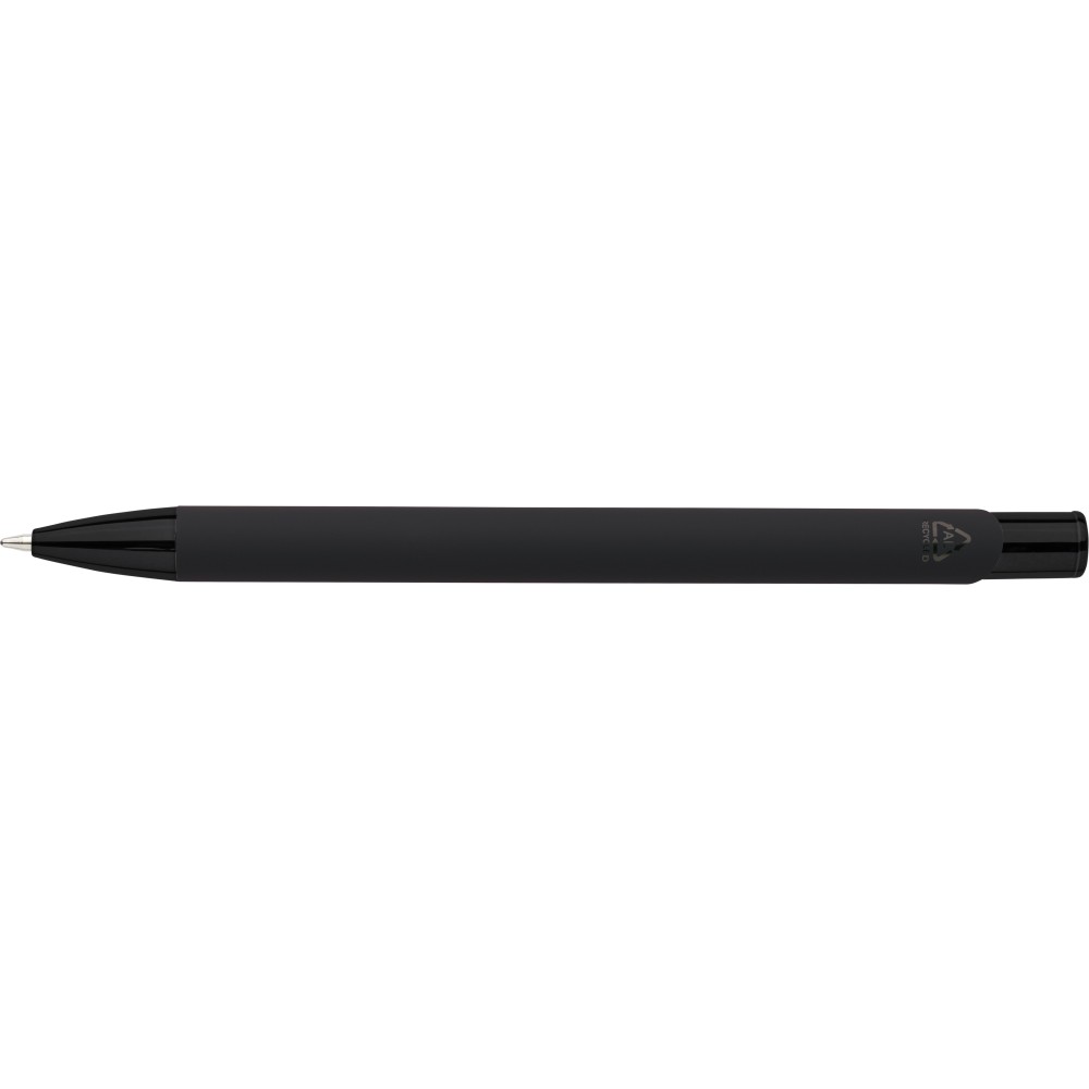 Recycled aluminium rubberized ballpen with matching UV-coated plastic and metal details. Shiny mirror effect appears after engraving. Features engraved recycled logo and writes approx. 800 metres. Blue ink.