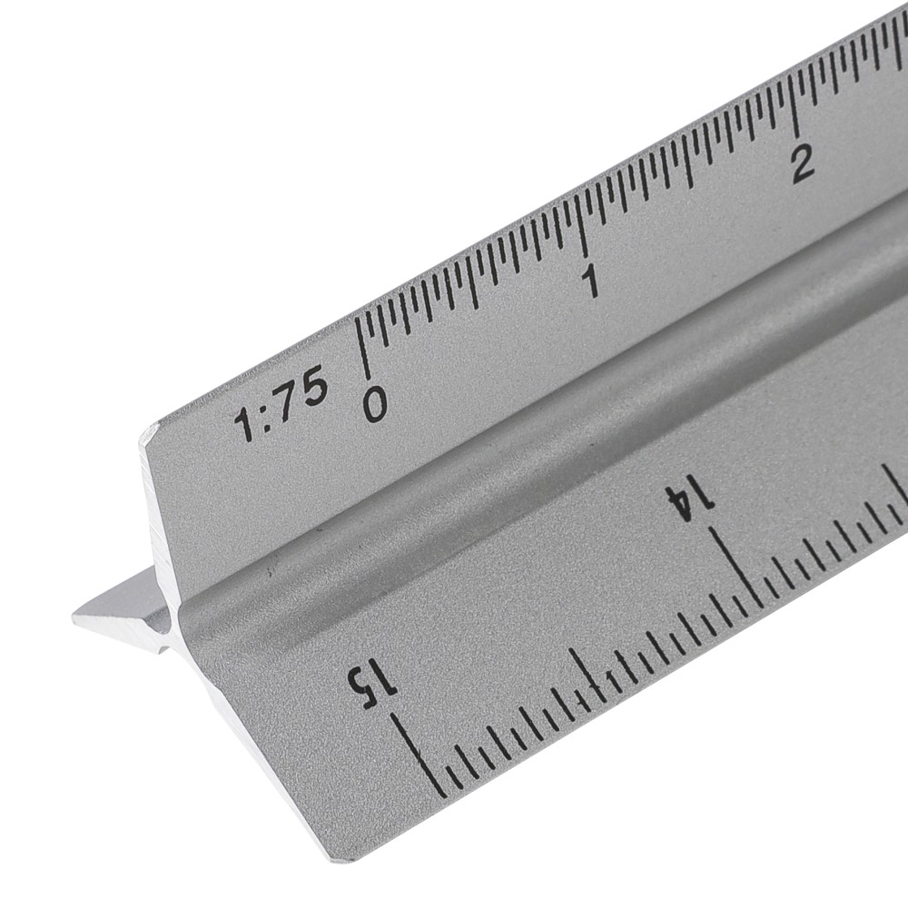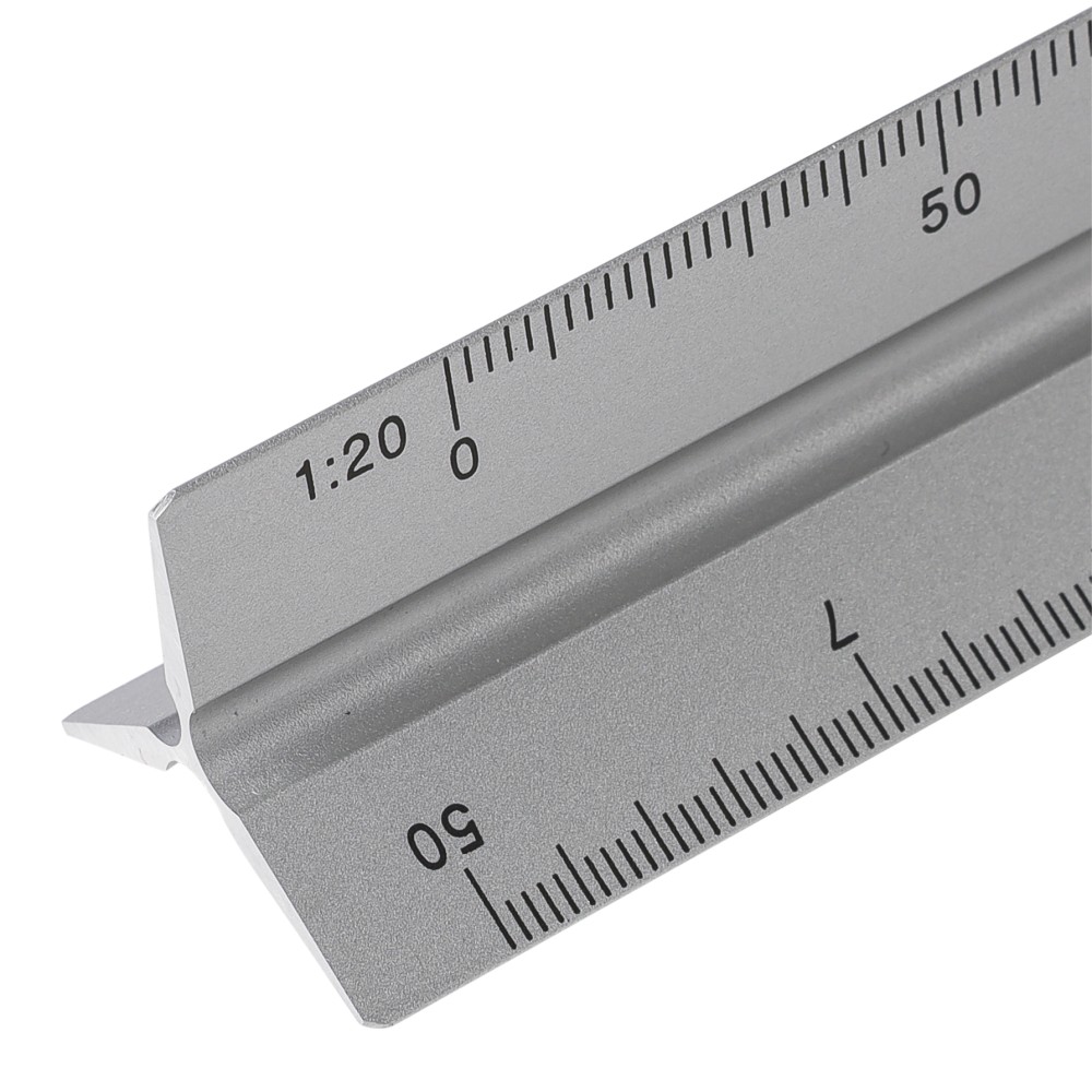 Aluminium 30 cm triangle-shaped ruler with multiple measuring scales: 1:20, 1:25, 1:50, 1:75, and 1:100. One side without scale for engraving. Includes both centimetre and inch markings. Individually packaged in a brown cardboard box.