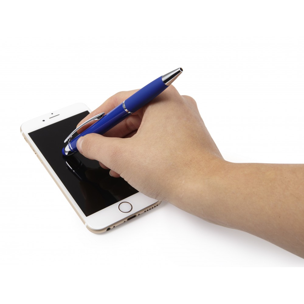 Aluminium ballpen with rubber grip and rubber tip suitable for capacitive screens. Black ink.