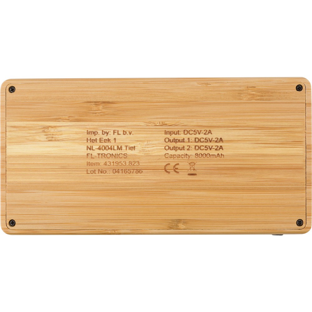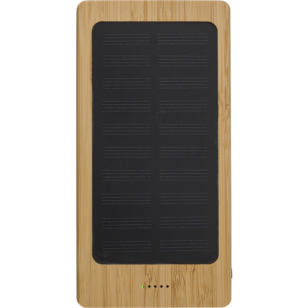 Bamboo solar power bank with a capacity of 8.000 mAh, two USB ports and one micro USB port and four LED indicators. Input: DC 5V/2A, output: DC 5V/2A. Including cable.