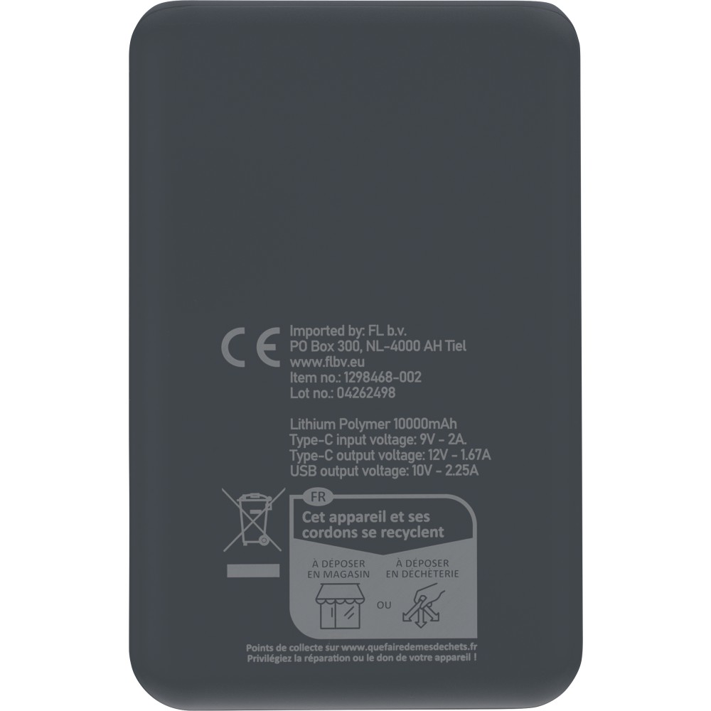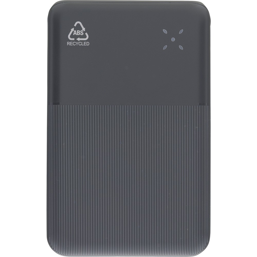 Recycled ABS powerbank (20,000 mAh). 22.5W fast charging. Type-C in/out, Type-A input. LED indicator, safety protections. Recycled ABS logo on back. Packed in brown box with tissue paper.