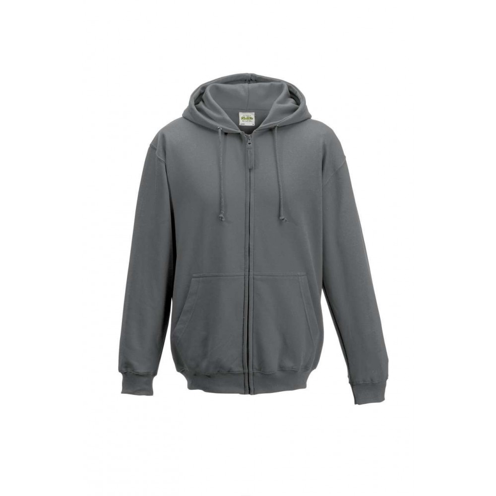80% Ringspun Cotton/20% Polyester. Standard fit. Full zip hoodie. Self-fabric covered YKK zip. Double fabric hood. Round drawcords. Kangaroo pouch pockets. Brushed inner fleece. Ribbed cuffs and hem. Twin needle stitching detail. Tear away label. 100% cotton faced fabric.