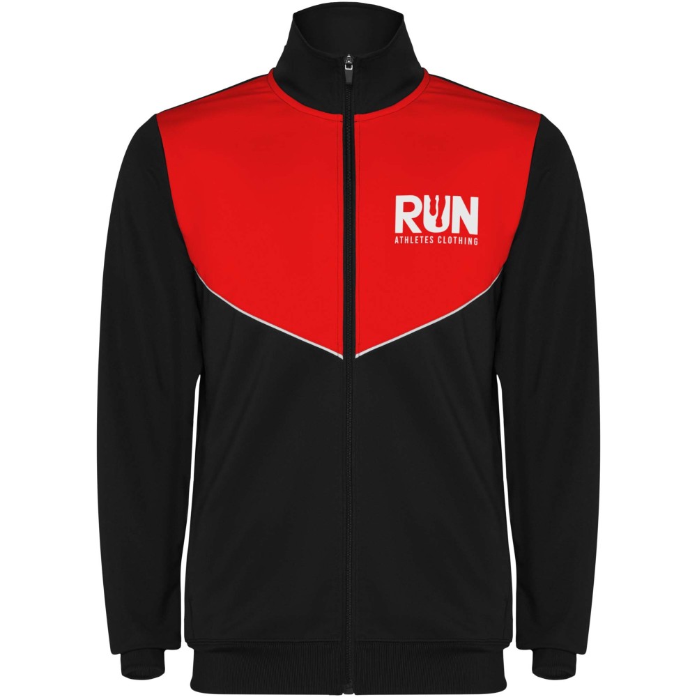 Tracksuit in lightweight and elastic fabric. Jacket with contrasting colour and sewing trims on the chest. High collar with contrasting seams. Center front zip. Side pockets. 2x2 ribbed cuffs and waist. Trousers with elastic waistband and drawstring. Contrasting side piece with sewing trim. Zipped hem.