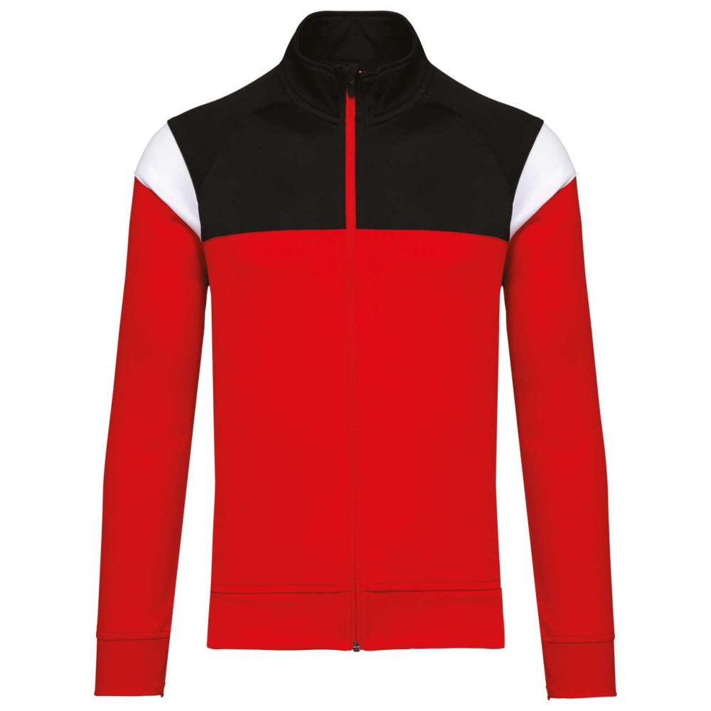 100% matte polyester interlock. Straight fit. Front fastening with reverse zip in tone-on-tone nylon. Raglan sleeves with contrasting shoulder inserts. Contrasting chest and shoulder cut-out. 2 zipped front pockets. Textured fabric inserts on the sides and back. Zip cover at the upper neckline for added comfort. Detachable brand label for easy decoration access.