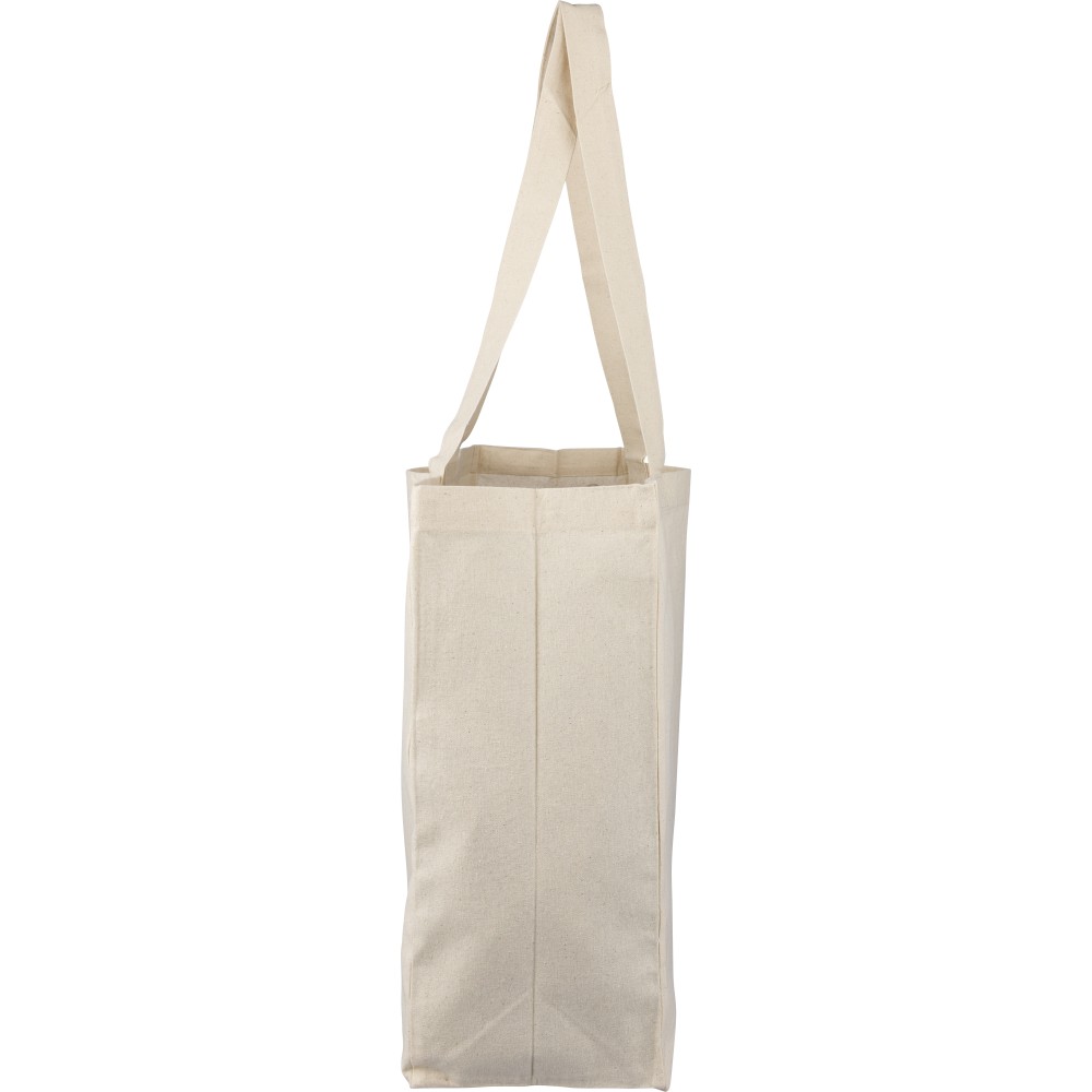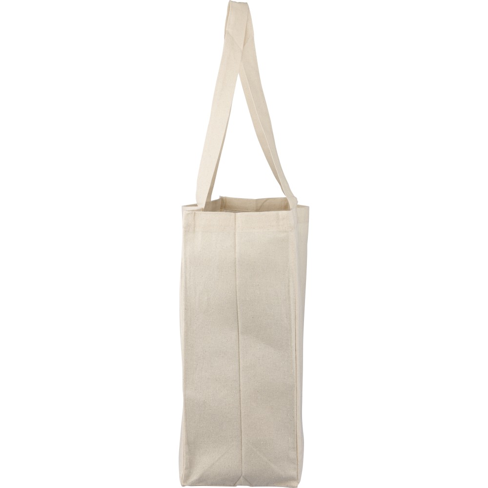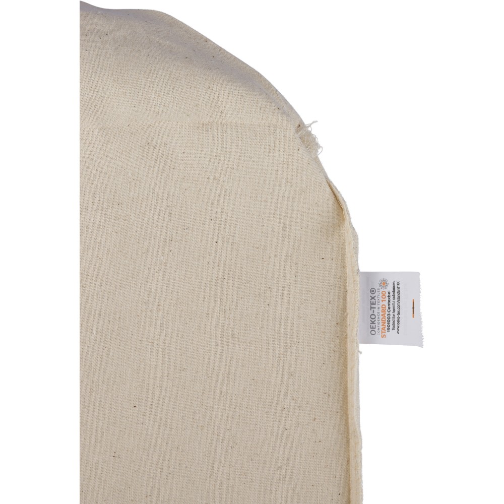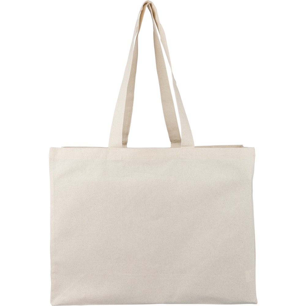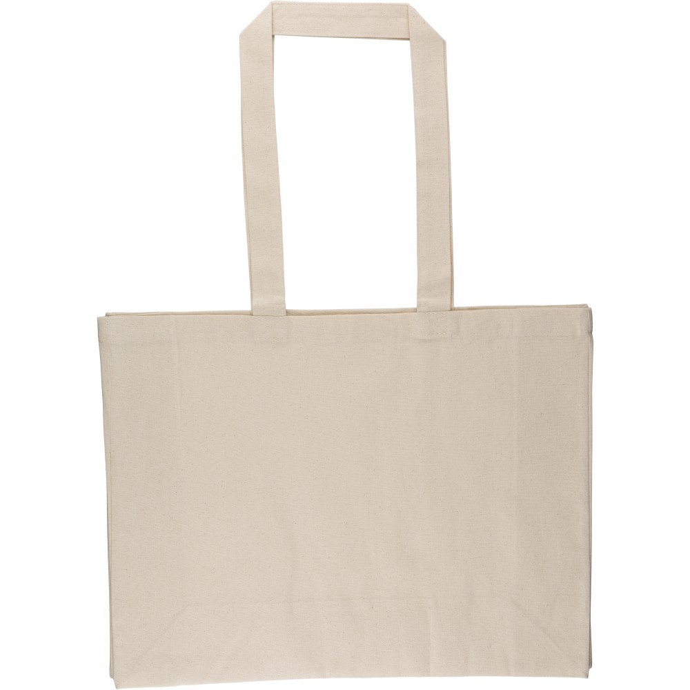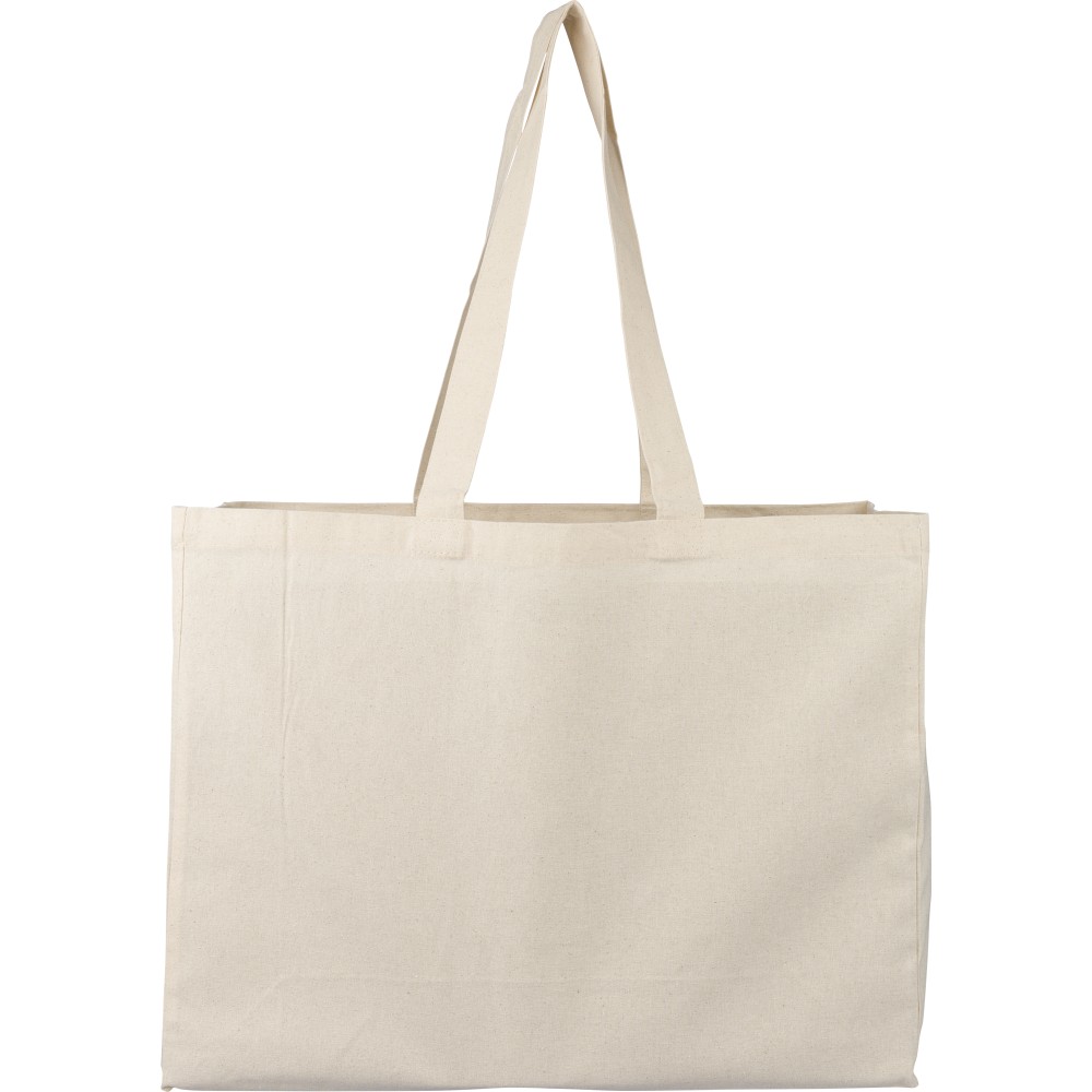 Oeko-Tex® cotton (180 gsm) shopping bag in natural color with D-shaped gusset. Size 43 × 34 × 13 cm with 67 cm long handles (3 cm width). Includes Oeko-Tex® label.