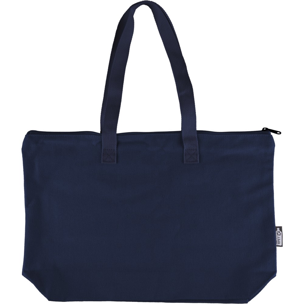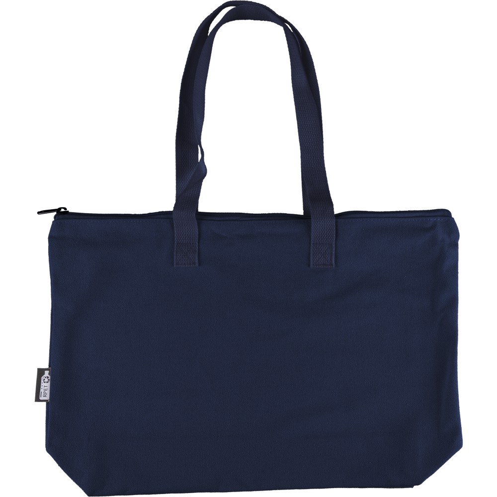 Recycled polycotton (330 gsm) tote bag with large zippered top compartment. Features long carrying handles (65 cm length, 2.5 cm width) and matching webbing. Includes rPET label on the outside and a label inside.