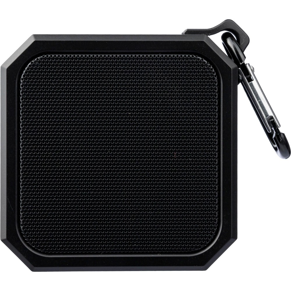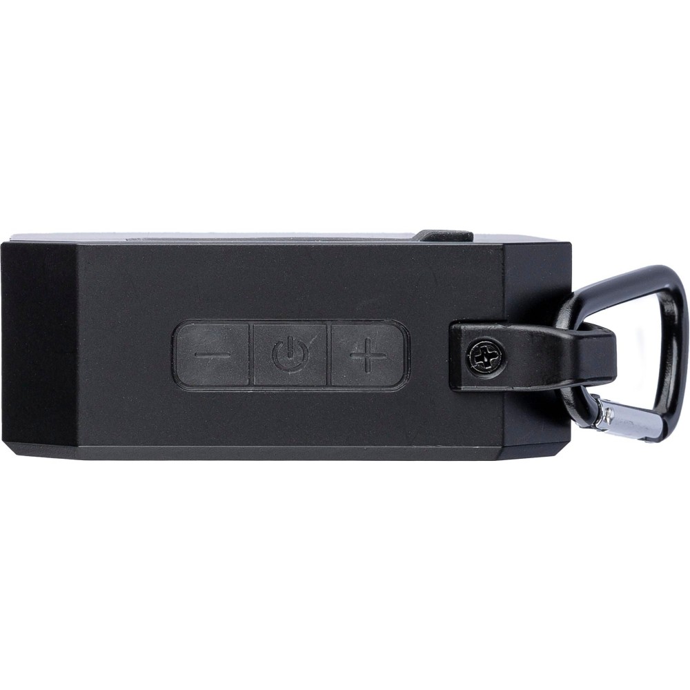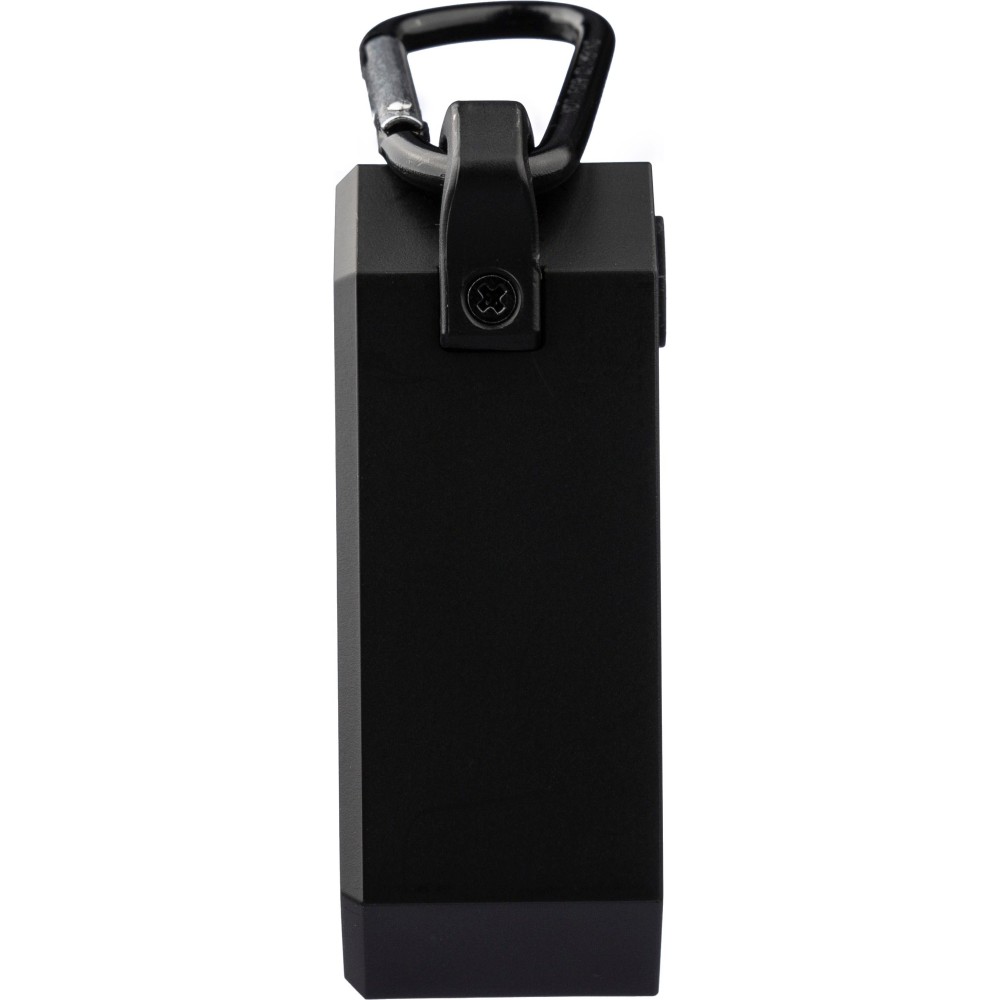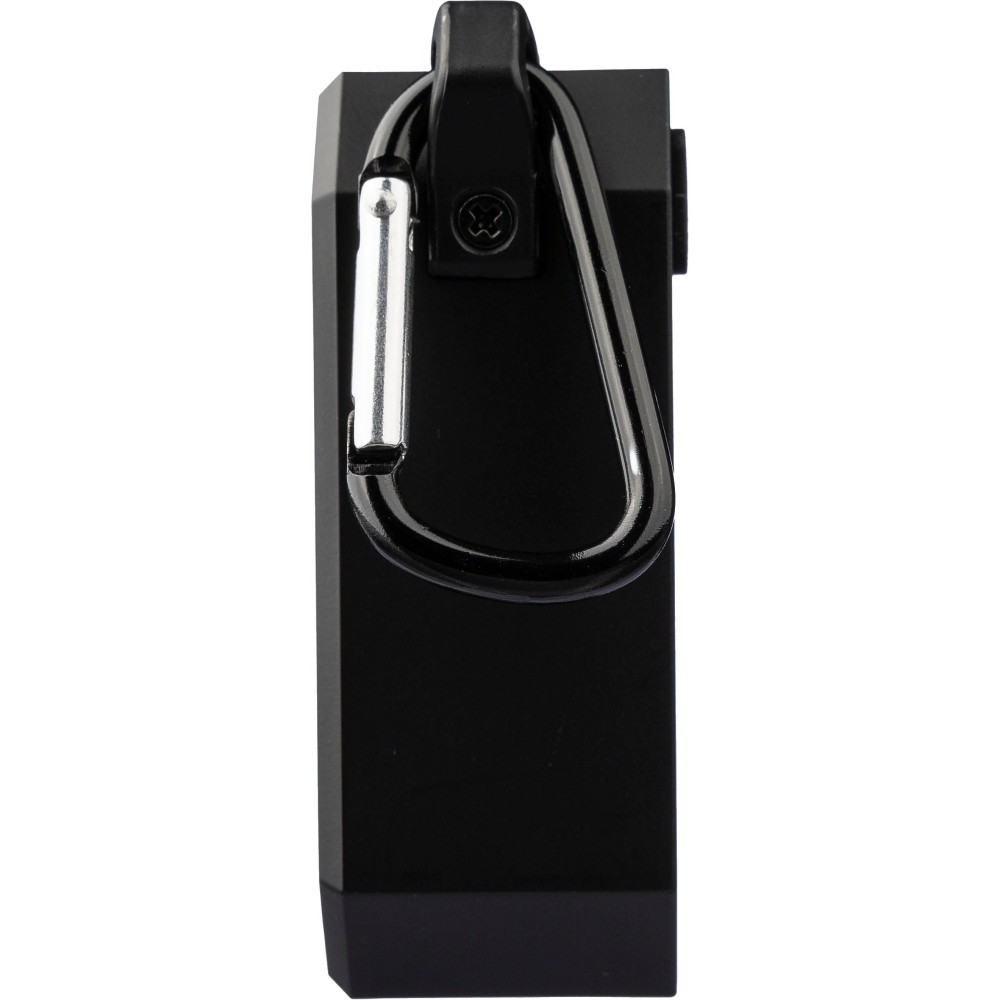 ABS speaker with carabiner and plastic clip. IPX4 rated. 3W output, DC 5V input, 300mAh built-in rechargeable battery, with 2 hours of playing time. Working distance of 15-20 meters, signal-to-noise ratio of 87 dB. Frequency range: 100 Hz to 20 kHz. Includes 50 cm Type-C charging cable. Wireless connection technology: 5.2. Individually packaged in a brown cardboard box.