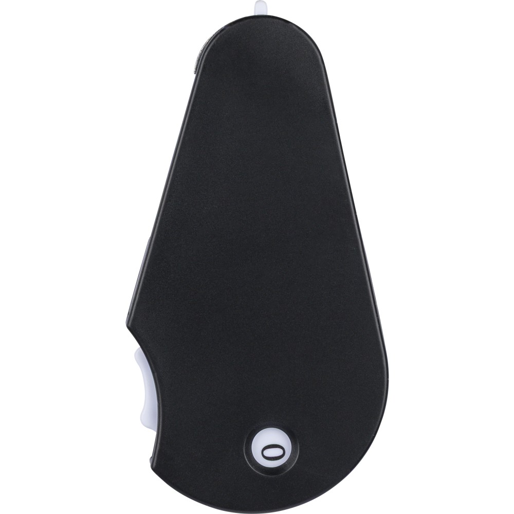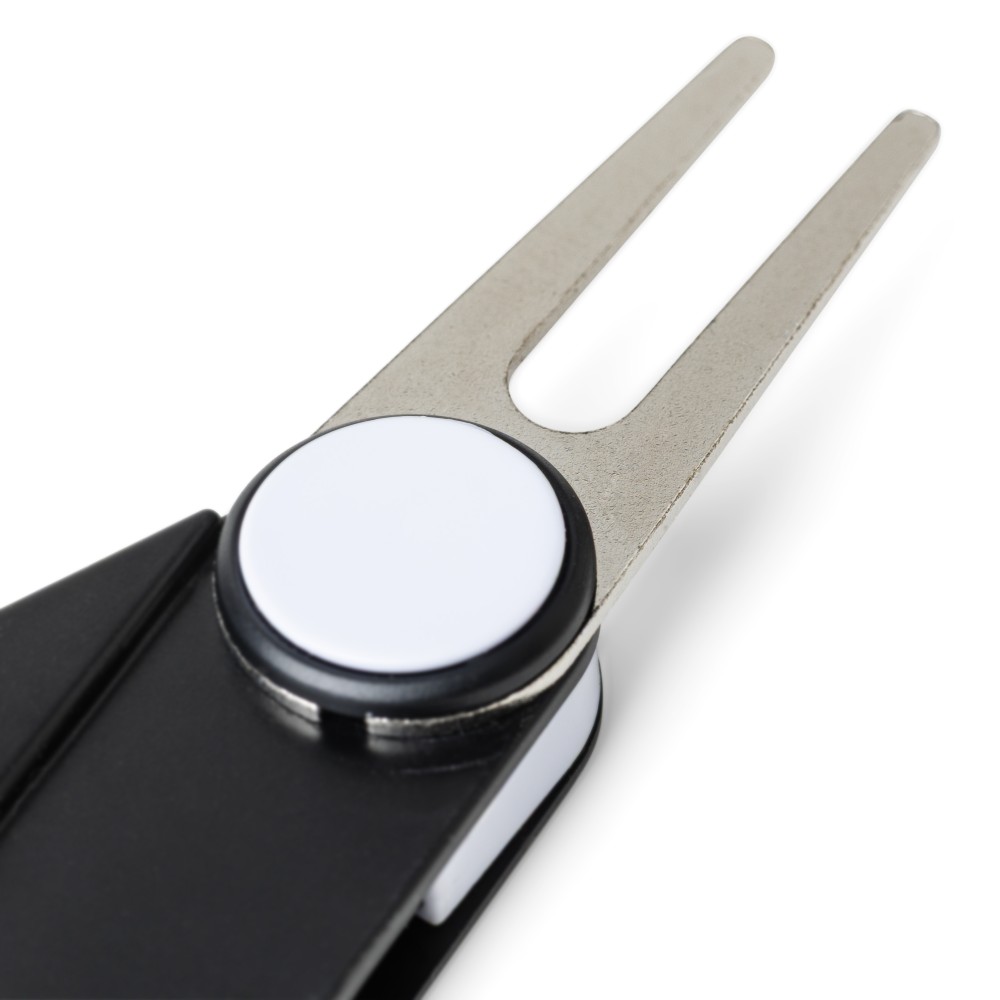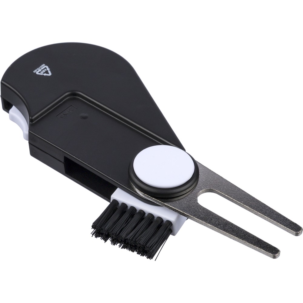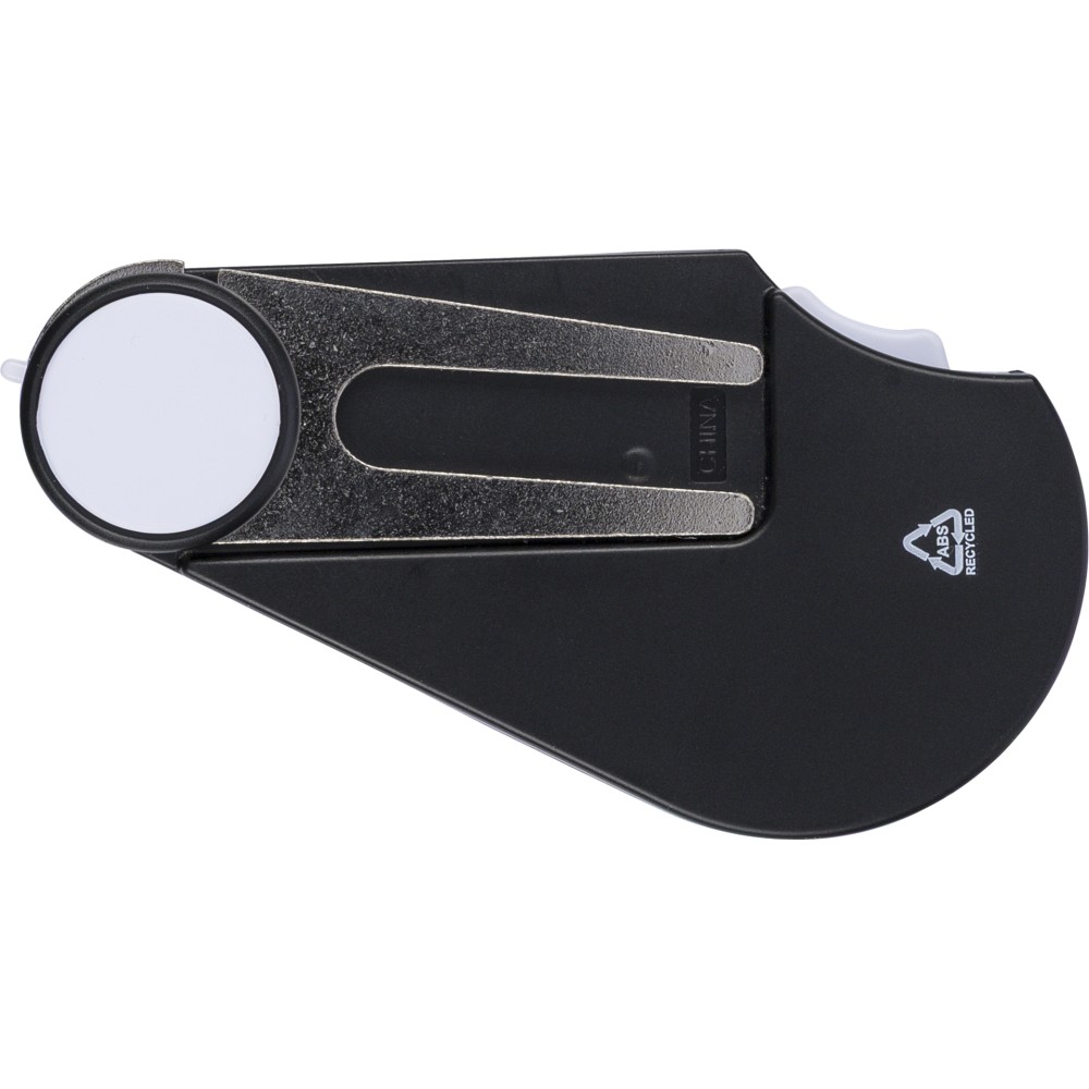 Recycled ABS multifunctional golf tool with integrated marker, pitch fork, cleaning brush, and score counter. Features a Recycled ABS logo on the backside. Packed in a recycled polybag.