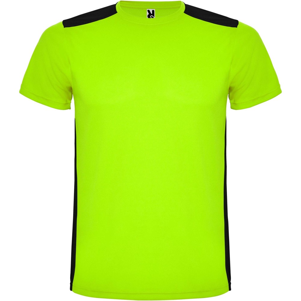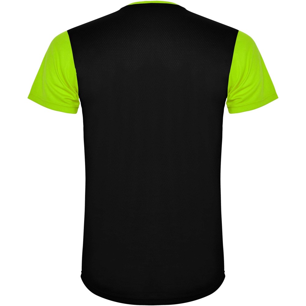 Easy-dry, technical and breathable fabric. Crew neck. Combination of two polyester fabrics on the back and shoulders. Bird's eye fabric on front and breathable 3D mesh fabric at the back. Fabric prepared for moisture absorption. Decorative zigzag backstitch on sides and shoulders. Back pattern slightly longer. Removable label.