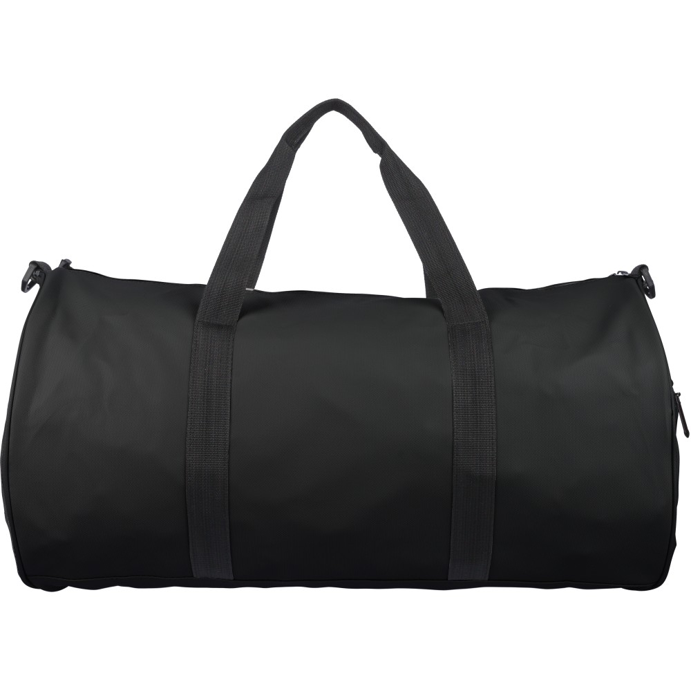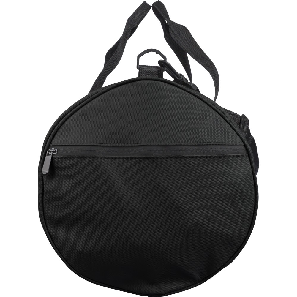 rPET duffle bag made from 600D polyester with 210D lining and water-repellent PU coating. Features a 40 l main compartment, front and side zippered pockets, mesh side pocket, two handles, and adjustable shoulder strap. Includes external rPET label.