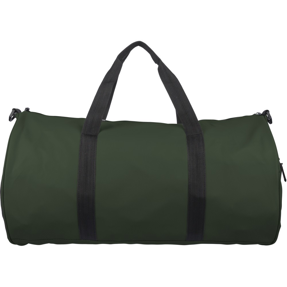 rPET duffle bag made from 600D polyester with 210D lining and water-repellent PU coating. Features a 40 l main compartment, front and side zippered pockets, mesh side pocket, two handles, and adjustable shoulder strap. Includes external rPET label.