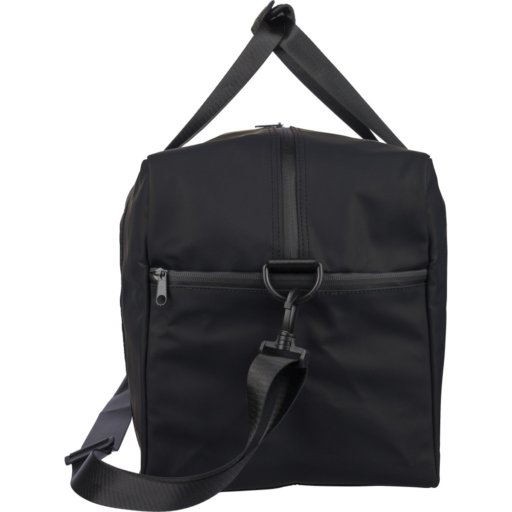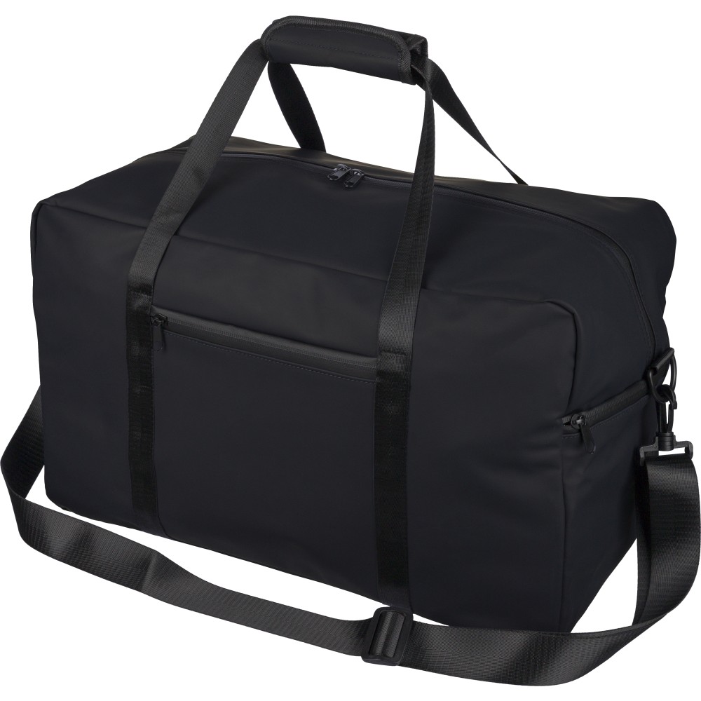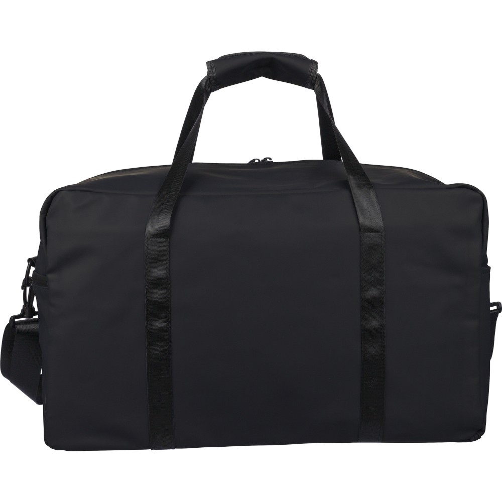 Recycled PU duffle bag (35 l) with 210D recycled polyester lining. Features 108 cm handles (2.5 cm wide) with velcro, 130 cm adjustable strap (3.9 cm wide), front zip pocket, and large main compartment. Recycled logo inside the label.