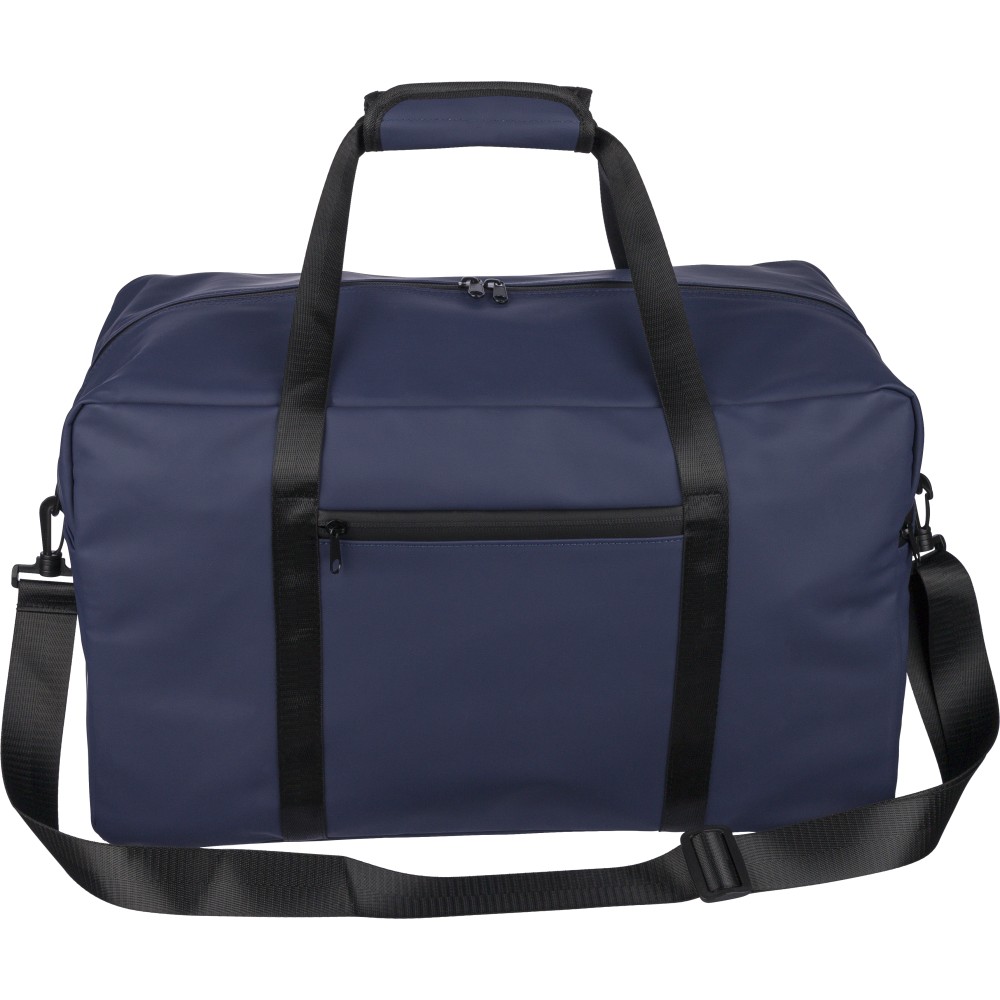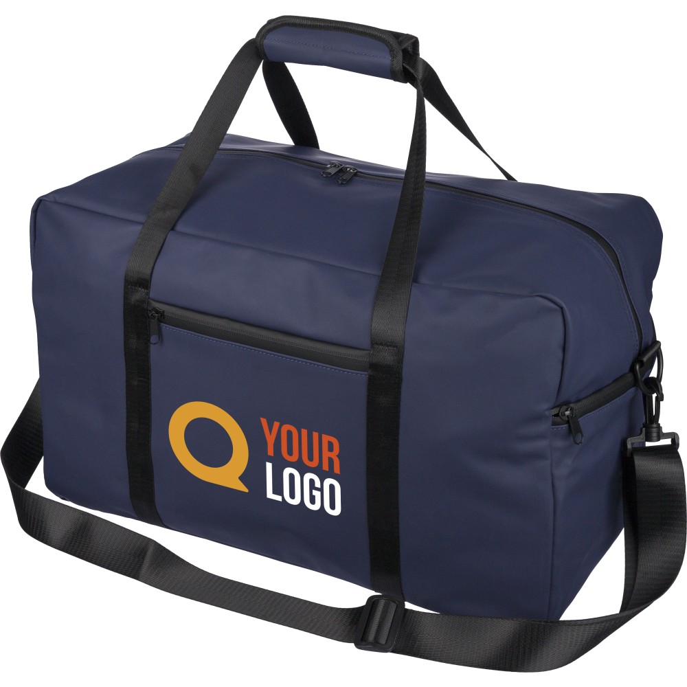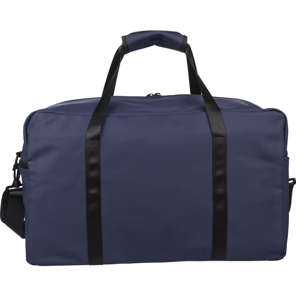 Recycled PU duffle bag (35 l) with 210D recycled polyester lining. Features 108 cm handles (2.5 cm wide) with velcro, 130 cm adjustable strap (3.9 cm wide), front zip pocket, and large main compartment. Recycled logo inside the label.