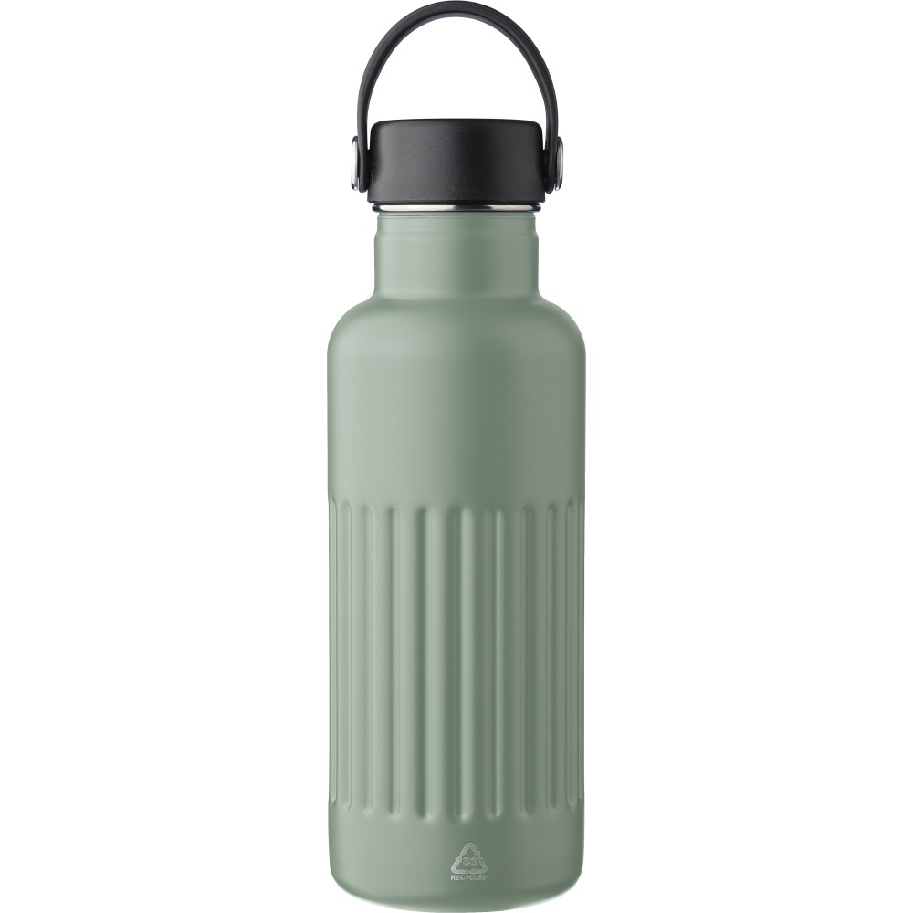 Recycled stainless steel double-walled drinking bottle (500 ml). The interior is made of stainless steel 304, and the exterior is stainless steel 201 with a ridge grip design. Features a PP and iron lid with a TPE handle for easy carrying. Includes an engraved recycled logo on the body. Individually packaged in a brown cardboard box.