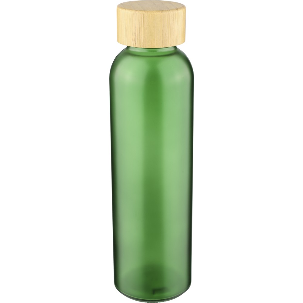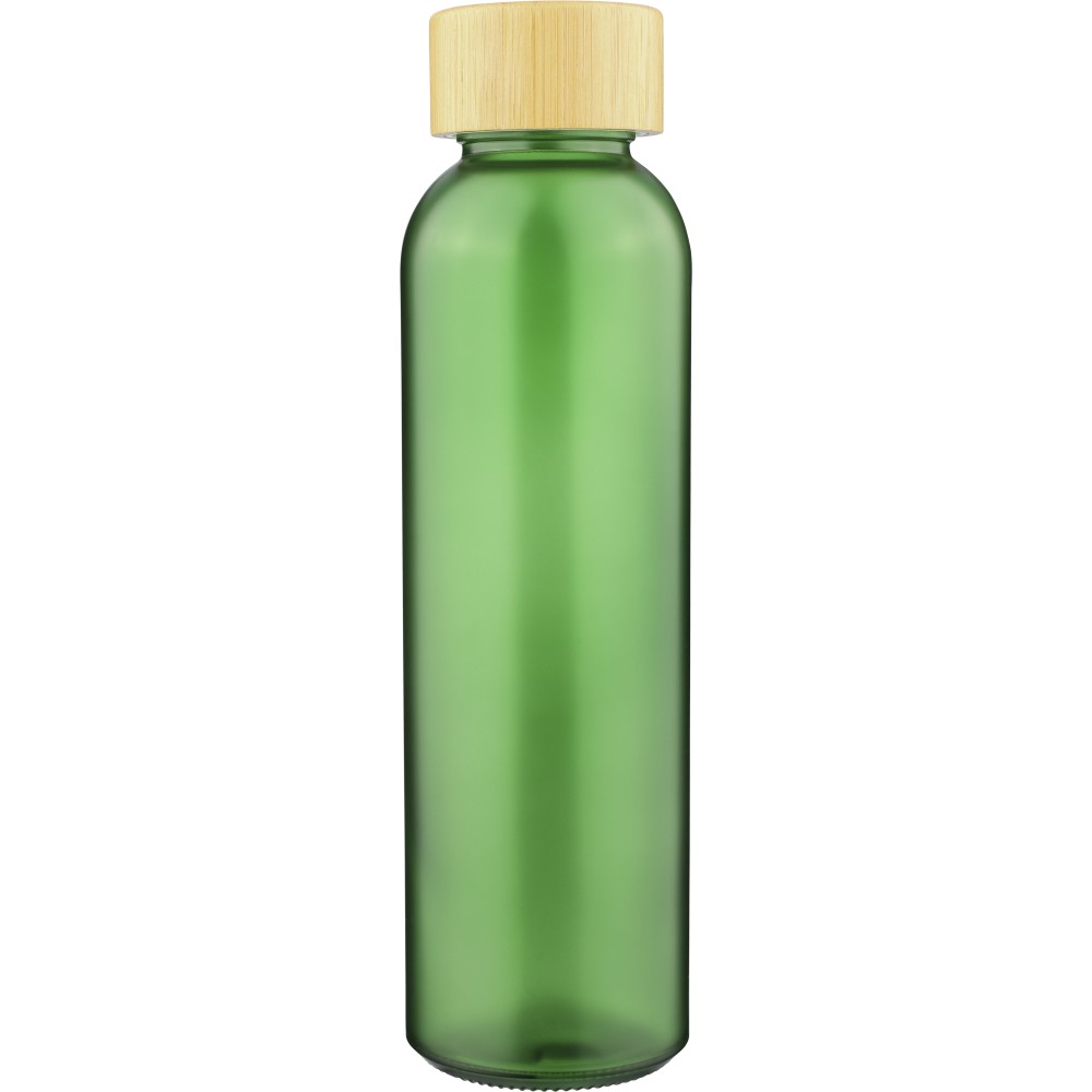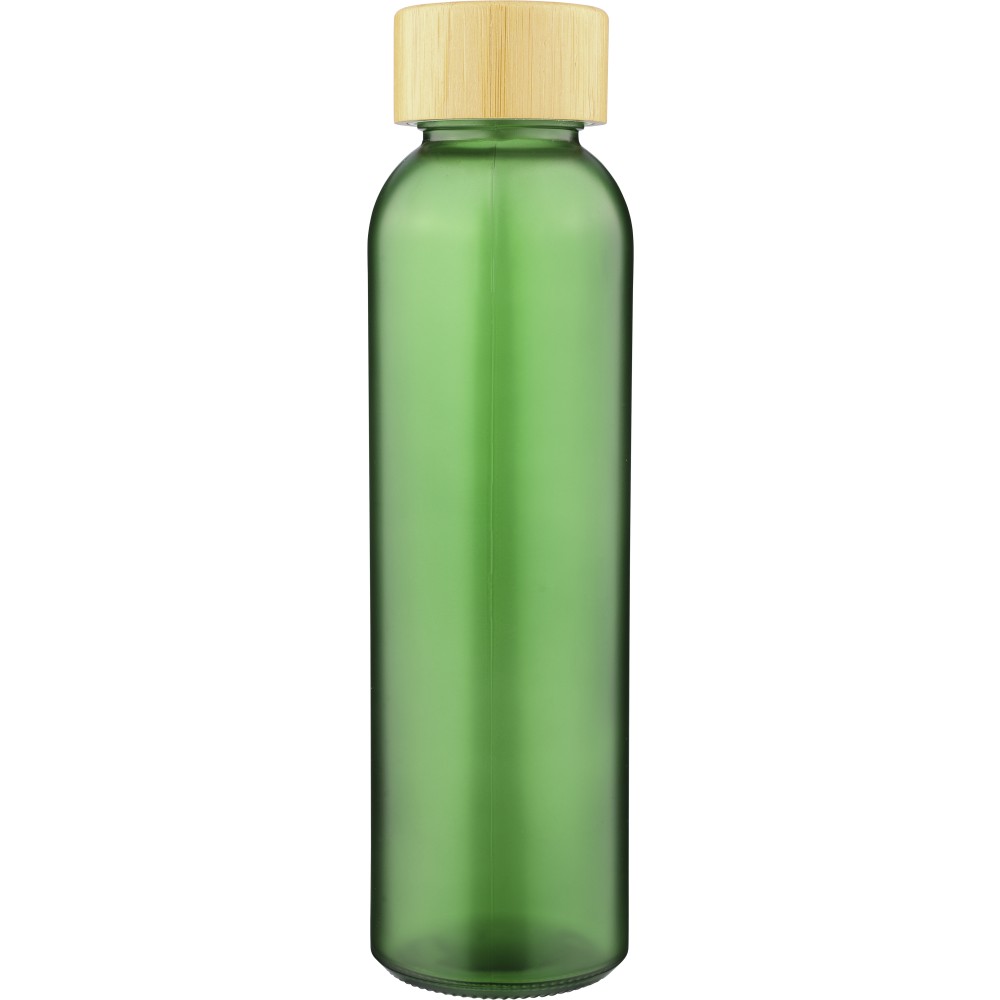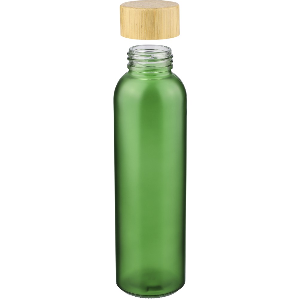Glass drinking bottle (500 ml) with a frosted coated body and bamboo screw lid with PP inner core. Made from sodium calcium glass, suitable for cold drinks only. Individually packaged in a brown cardboard box.