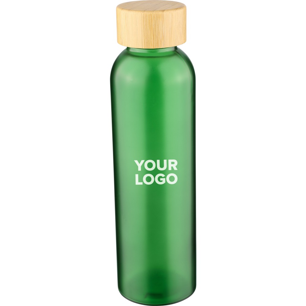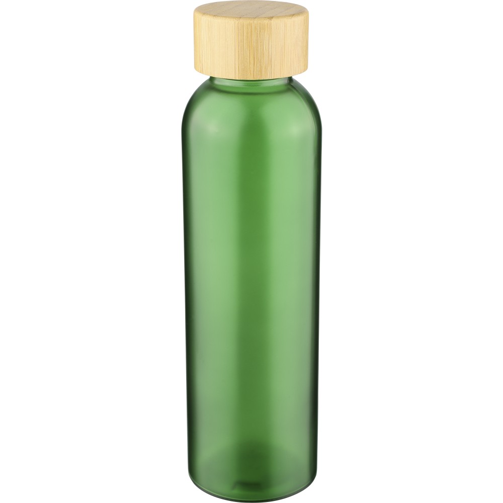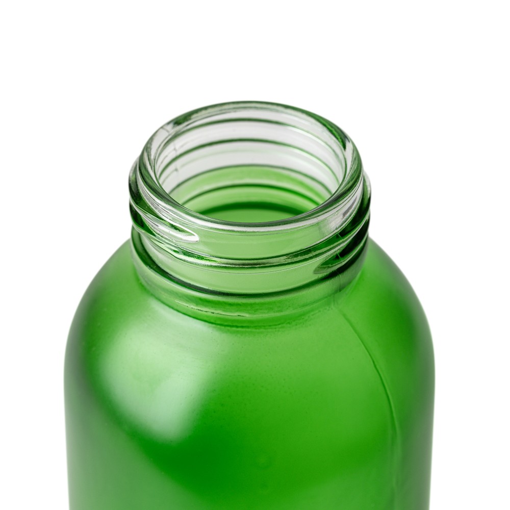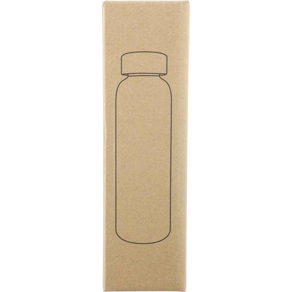 Glass drinking bottle (500 ml) with a frosted coated body and bamboo screw lid with PP inner core. Made from sodium calcium glass, suitable for cold drinks only. Individually packaged in a brown cardboard box.